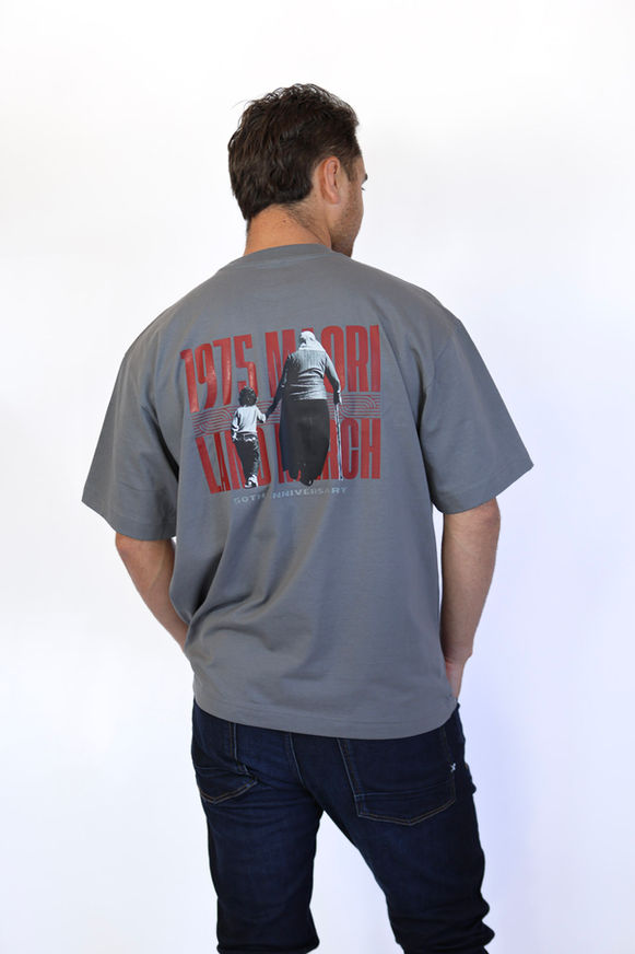 A structured, cropped silhouette with the weight and presence of a true statement piece. This 50th Anniversary tee honours one of Aotearoa’s most defining moments, the 1975 Māori Land March, led by Dame Whina Cooper and supported by thousands who walked to protect what remained of Māori land.