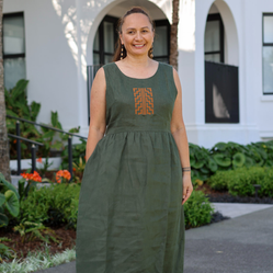 An elegant linen dress inspired by the tukutuku poutama pattern - symbolizing growth, learning, and the living legacy of Te Tiriti o Waitangi. Thoughtfully crafted for comfort, connection, and everyday sophistication.