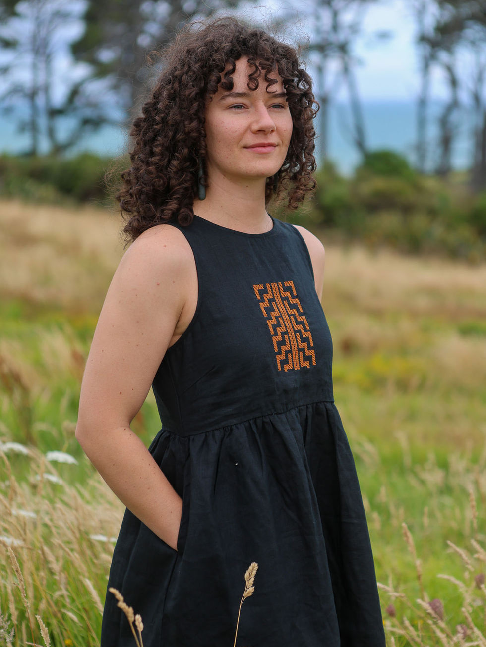 An elegant linen dress inspired by the tukutuku poutama pattern - symbolizing growth, learning, and the living legacy of Te Tiriti o Waitangi. Thoughtfully crafted for comfort, connection, and everyday sophistication.
