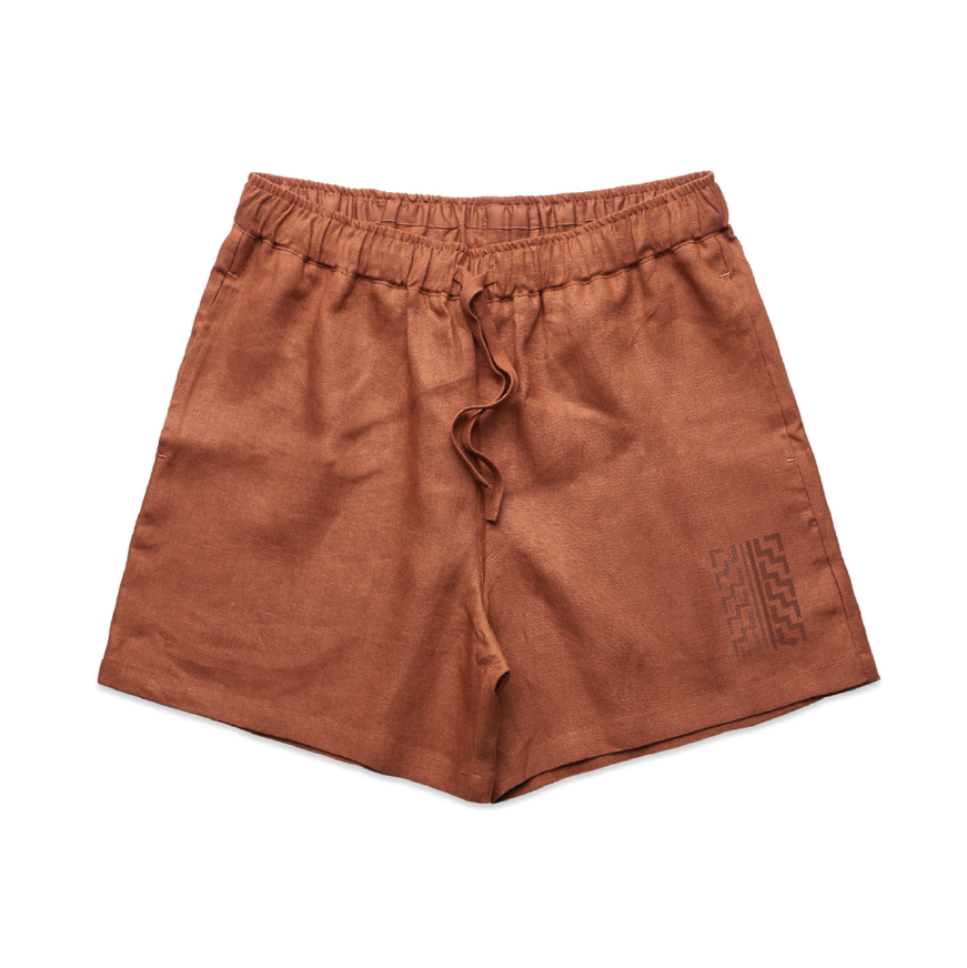 The Toitū Te Tiriti Linen Shorts are a sophisticated yet meaningful addition to your wardrobe. Featuring the tukutuku poutama pattern from the Memorial of Rights, this design symbolises the journey of growth, learning, and the enduring significance of Te Tiriti o Waitangi.